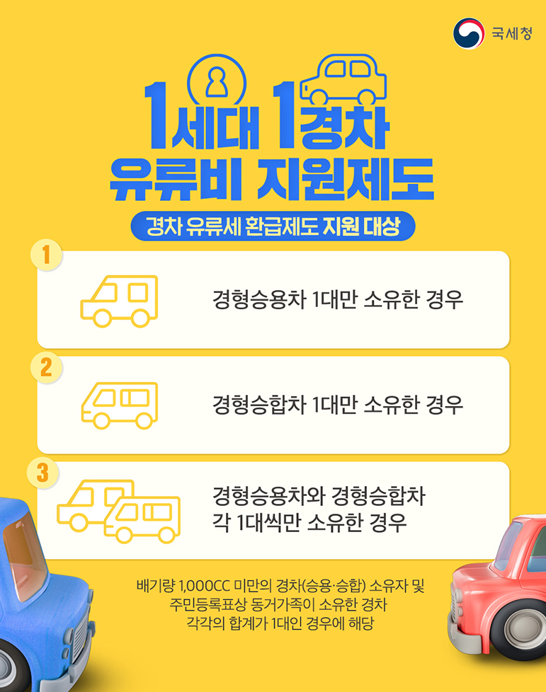 - 주민등록상 세대 구성원이 경차 1대만 소유