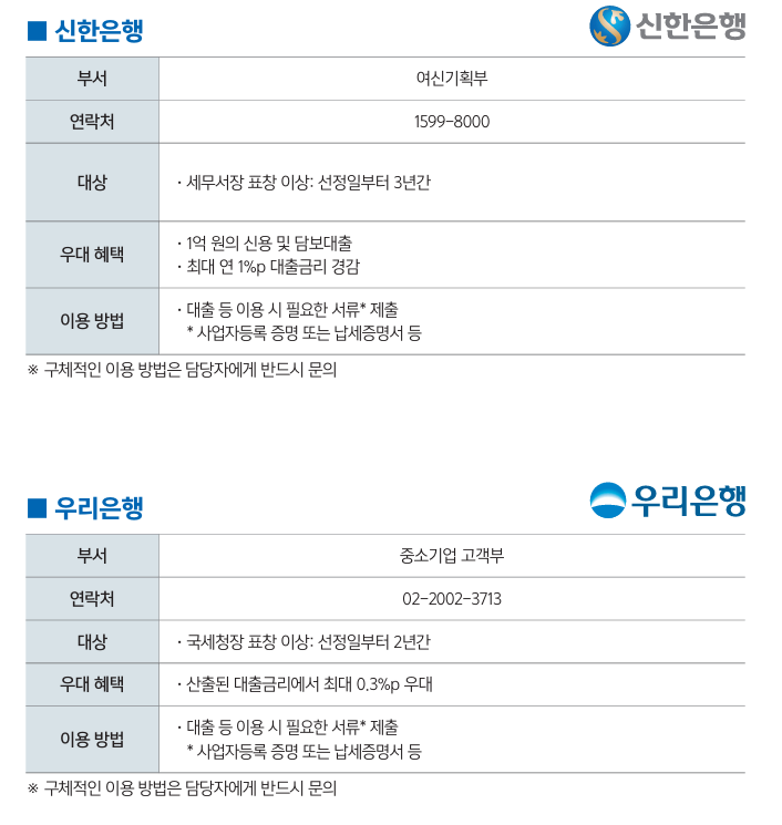 | IBK 기업은행 | 국세청장 표창 이상 | 전국 | 선정일부터 2년 |