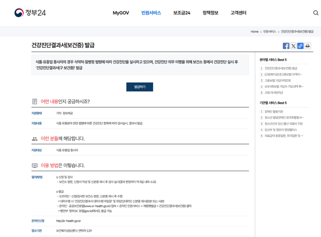 | 보건증 발급 (오프라인) | 검사 결과 확인 후 즉시 발급 |