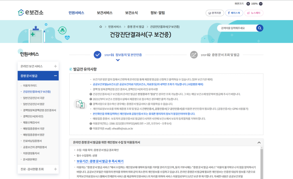 - ‘민원서비스 건강진단결과서(보건증) 발급’ 선택