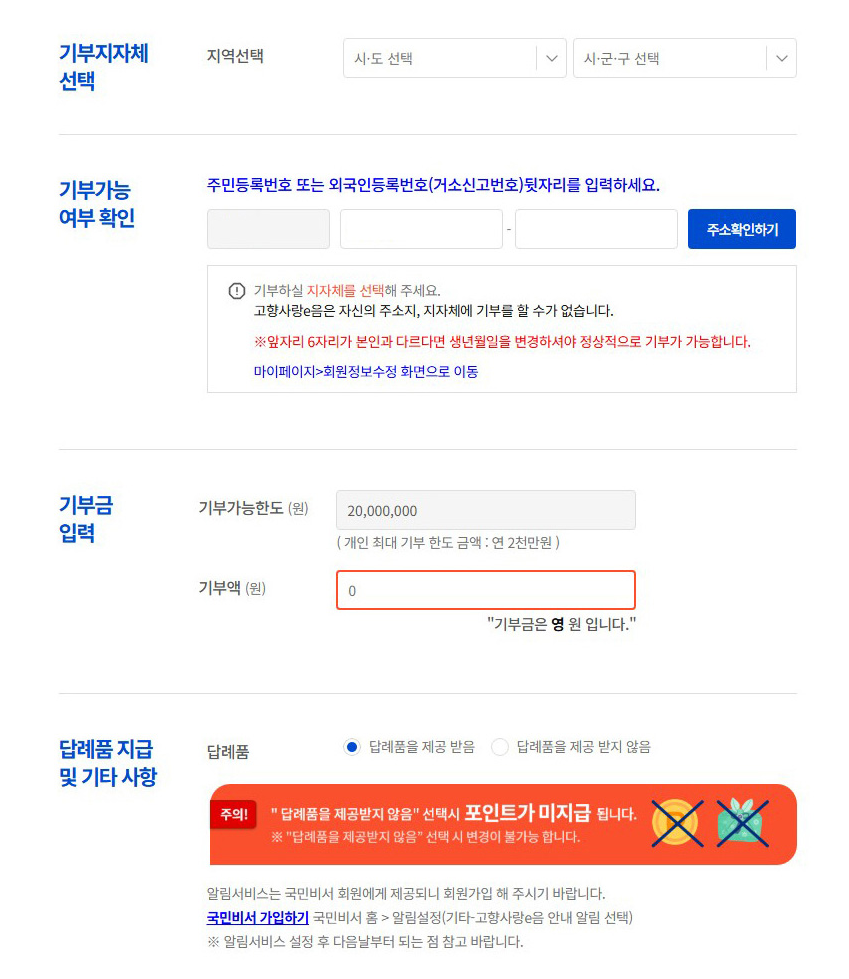 | 3 | 기부할 지자체 선택 (예: 경북 안동시, 경남 산청군 등) |