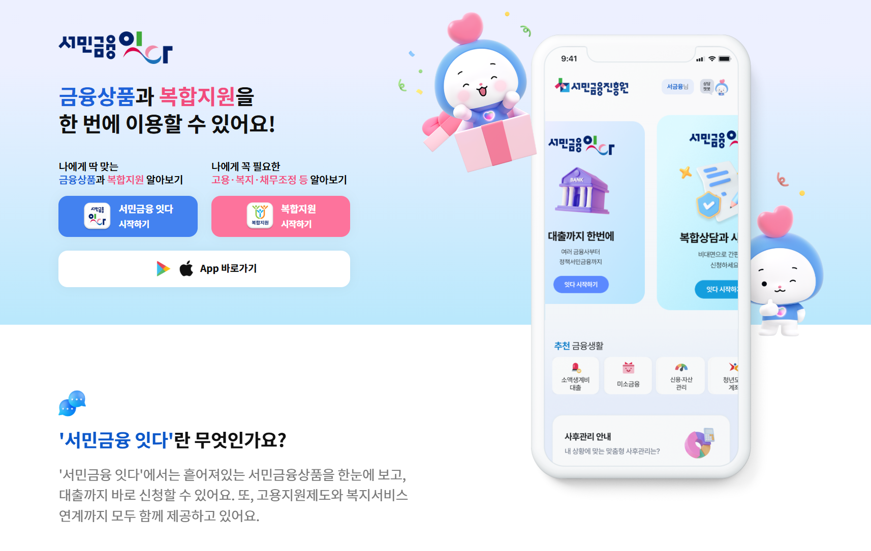 서민금융 잇다는 정부가 서민과 취약계층을 위해 만든 종합 금융 플랫폼입니다. 복잡한 절차 없이 대출 조회부터 신청까지 비대면으로 간편하게 이용할 수 있습니다.