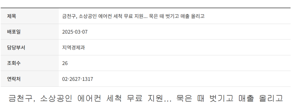 | 서울 금천구 | 소상공인 에어컨 세척 지원 | 에어컨 1대 세척 지원 | 2025년 3월 7일 ~ 3월 14일 |