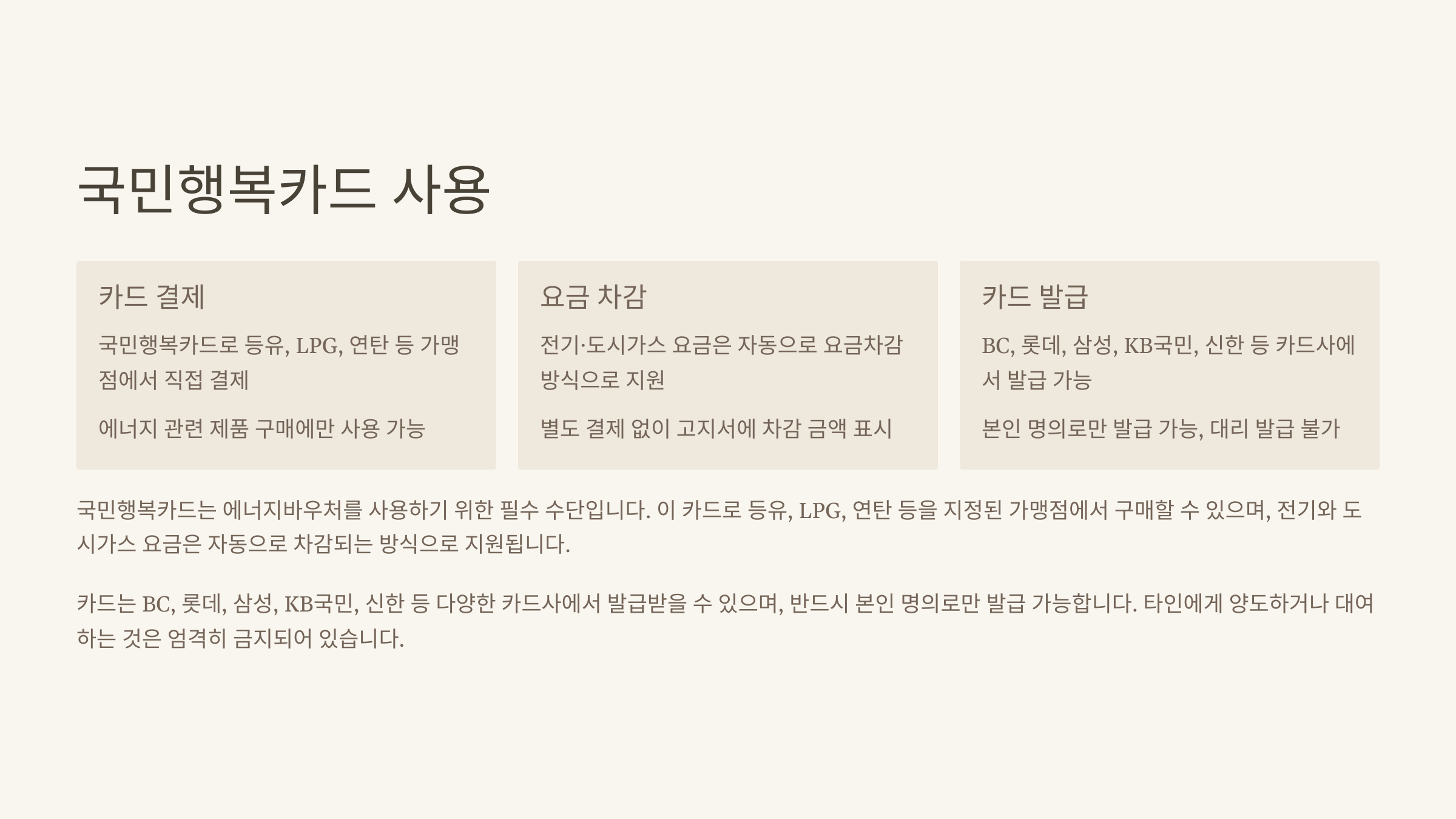 에너지바우처 지원금은 국민행복카드로도 사용할 수 있어요. 단, 본인만 사용 가능하고, 지정 가맹점에서만 결제가 가능합니다.