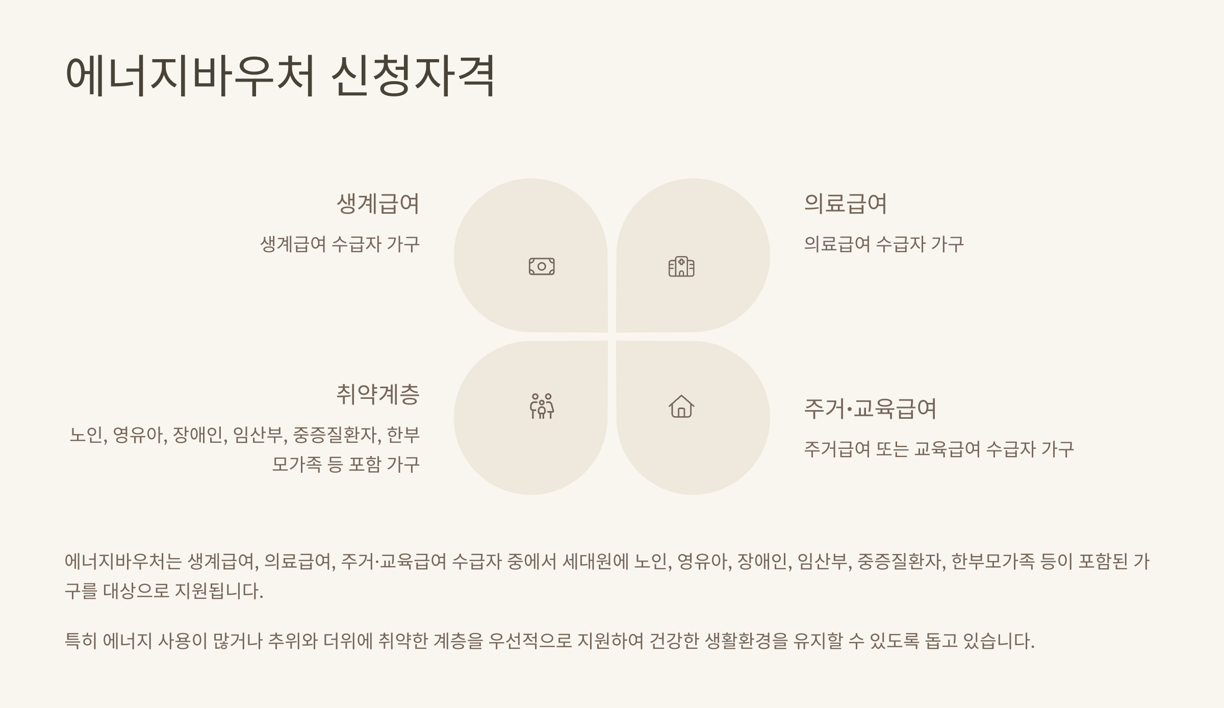 - 동절기(10~5월): 전기, 도시가스, 지역난방, 연탄, LPG, 등유 구매 지원