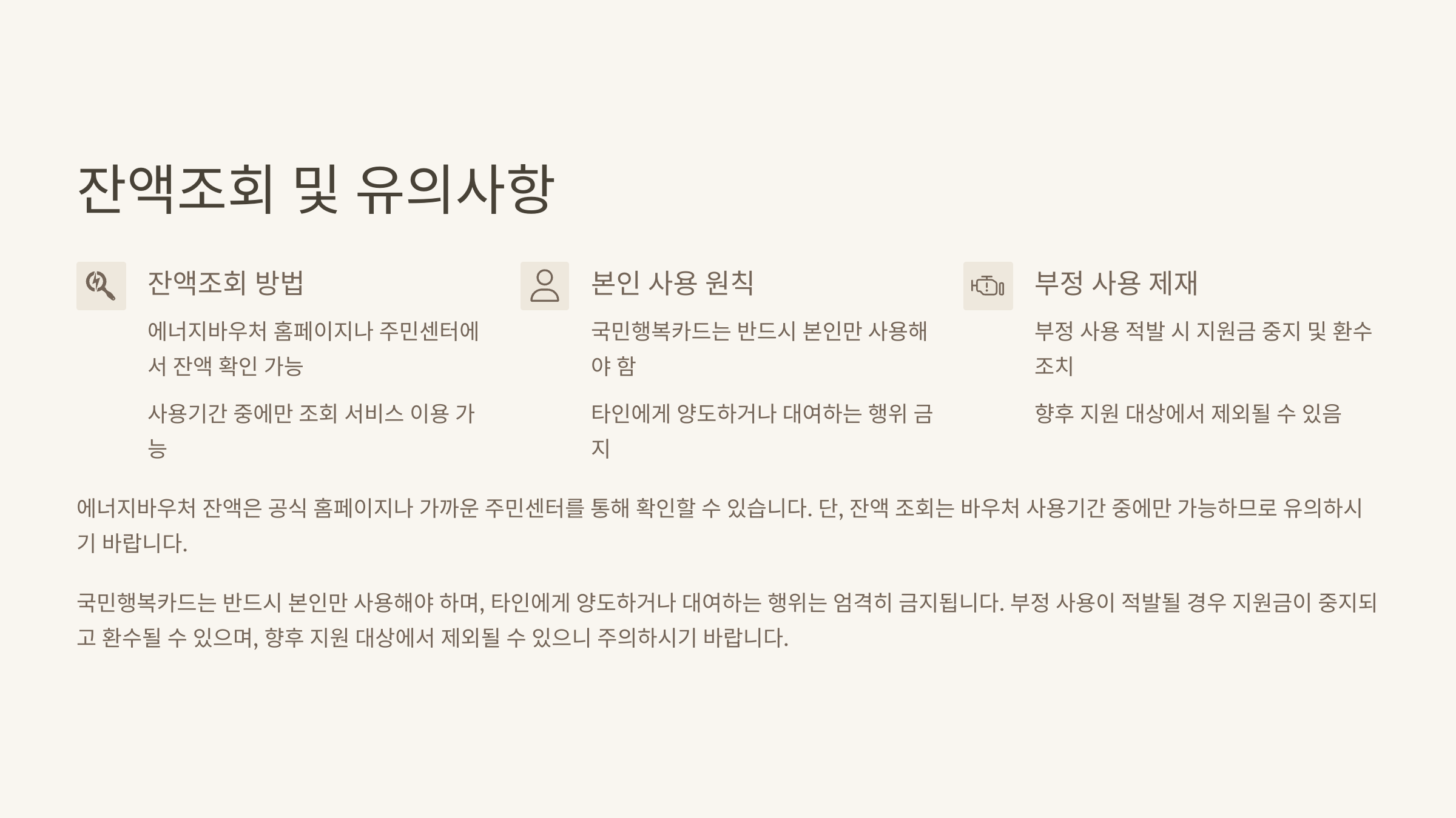 신청 후에는 홈페이지나 주민센터에서 잔액을 바로 조회할 수 있습니다. 반드시 본인 사용만 가능하고, 부정 사용은 지원 중지와 환수 조치될 수 있으니 주의하세요.