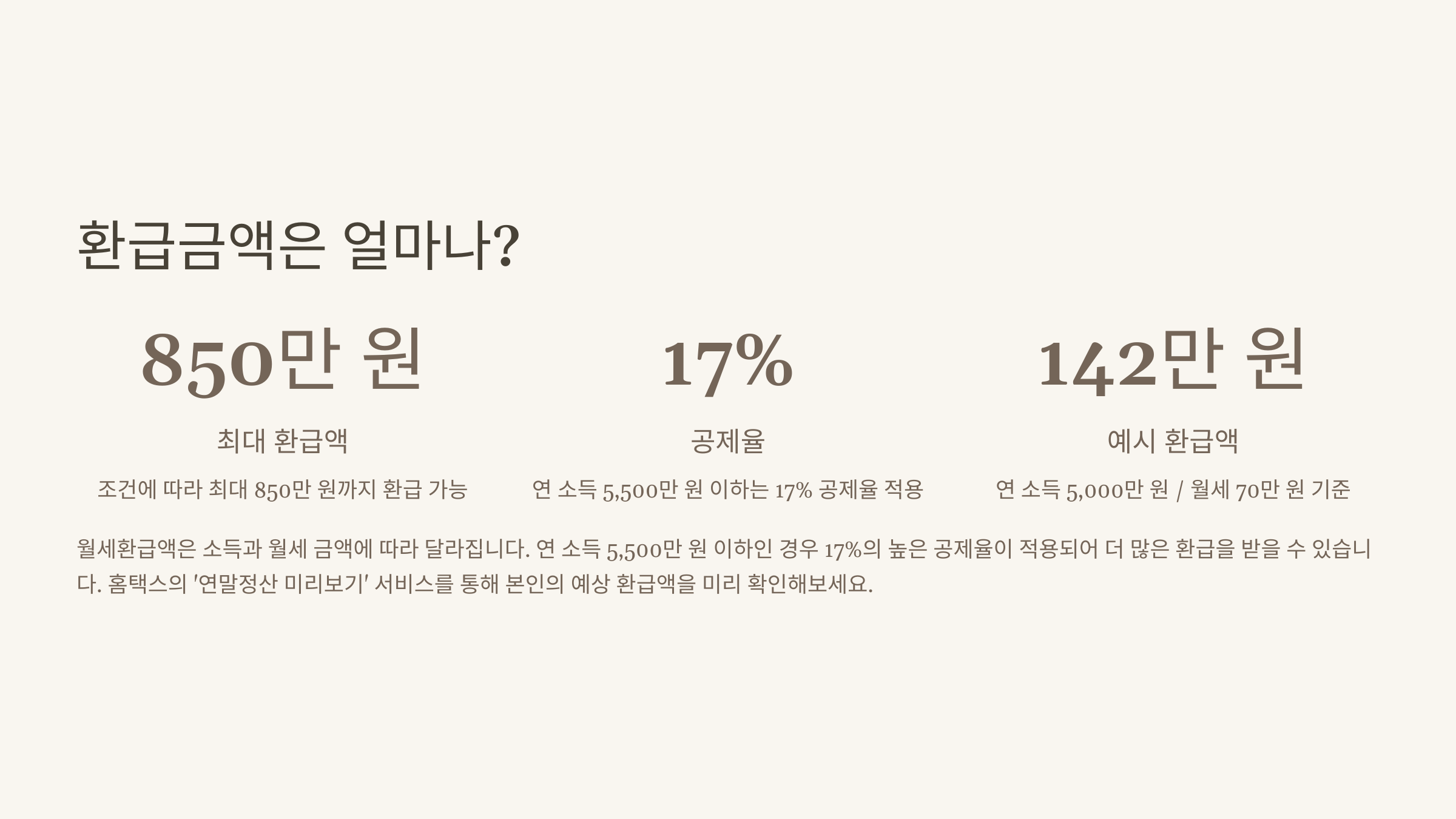 정부가 지원하는 2025년 월세 세액공제 제도를 통해 최대 850만 원까지 환급 받을 수 있습니다.