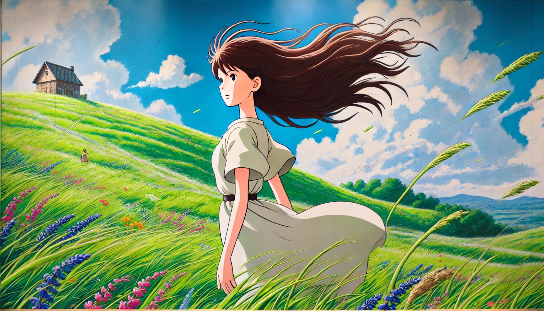 | 인물과 배경 | "A girl with flowing hair standing on a windy hill, Ghibli style with vibrant colors." 바람이 부는 언덕 위에 머리카락이 흩날리는 소녀, 생동감 있는 색감의 지브리 스타일. |