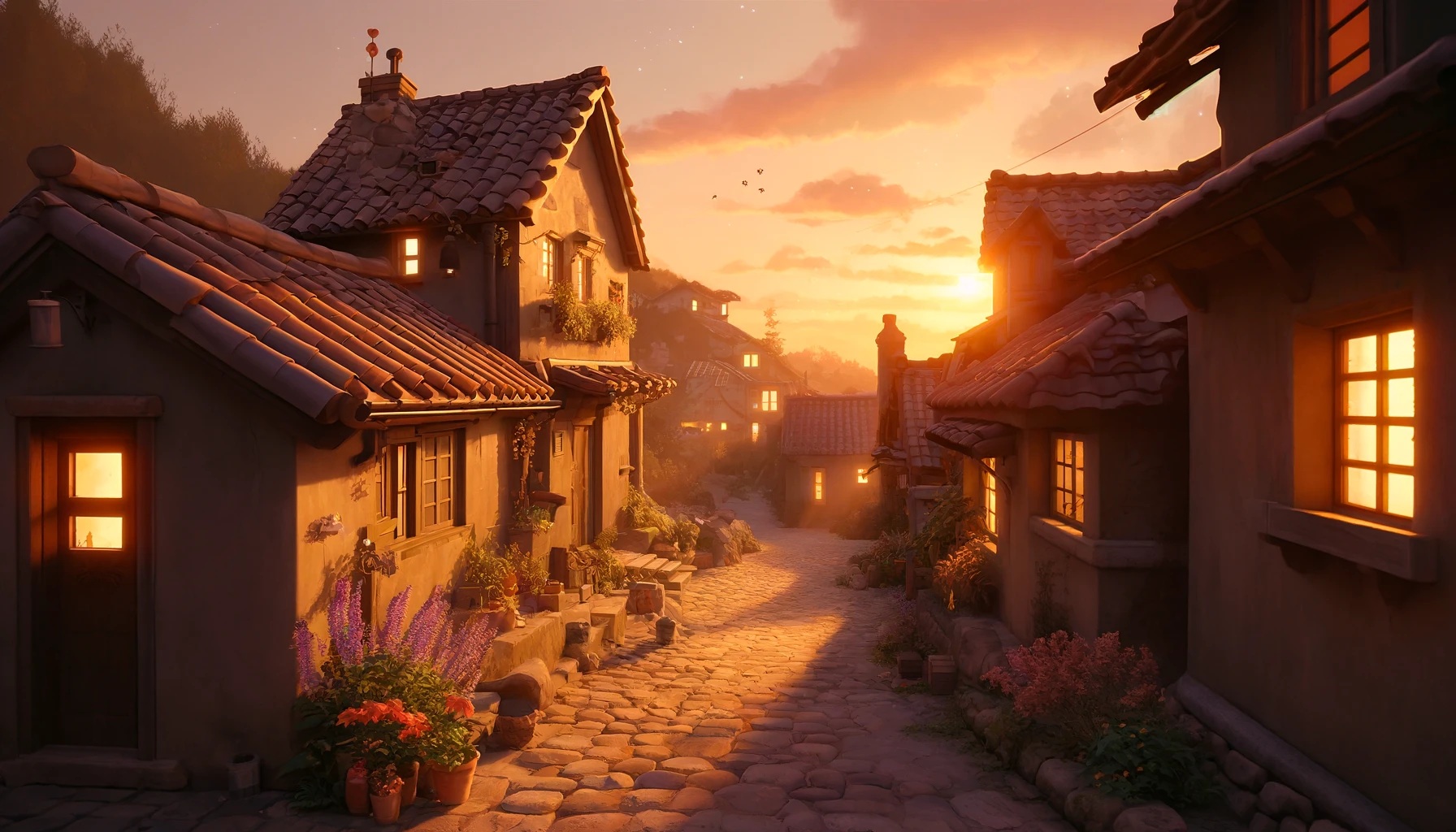 | 감성 일러스트 | "A peaceful village at sunset, drawn in Ghibli style with warm lighting and nostalgic atmosphere." 해질녘 따뜻한 조명과 향수를 불러일으키는 분위기의 평화로운 마을, 지브리 스타일로 그려진 장면. |