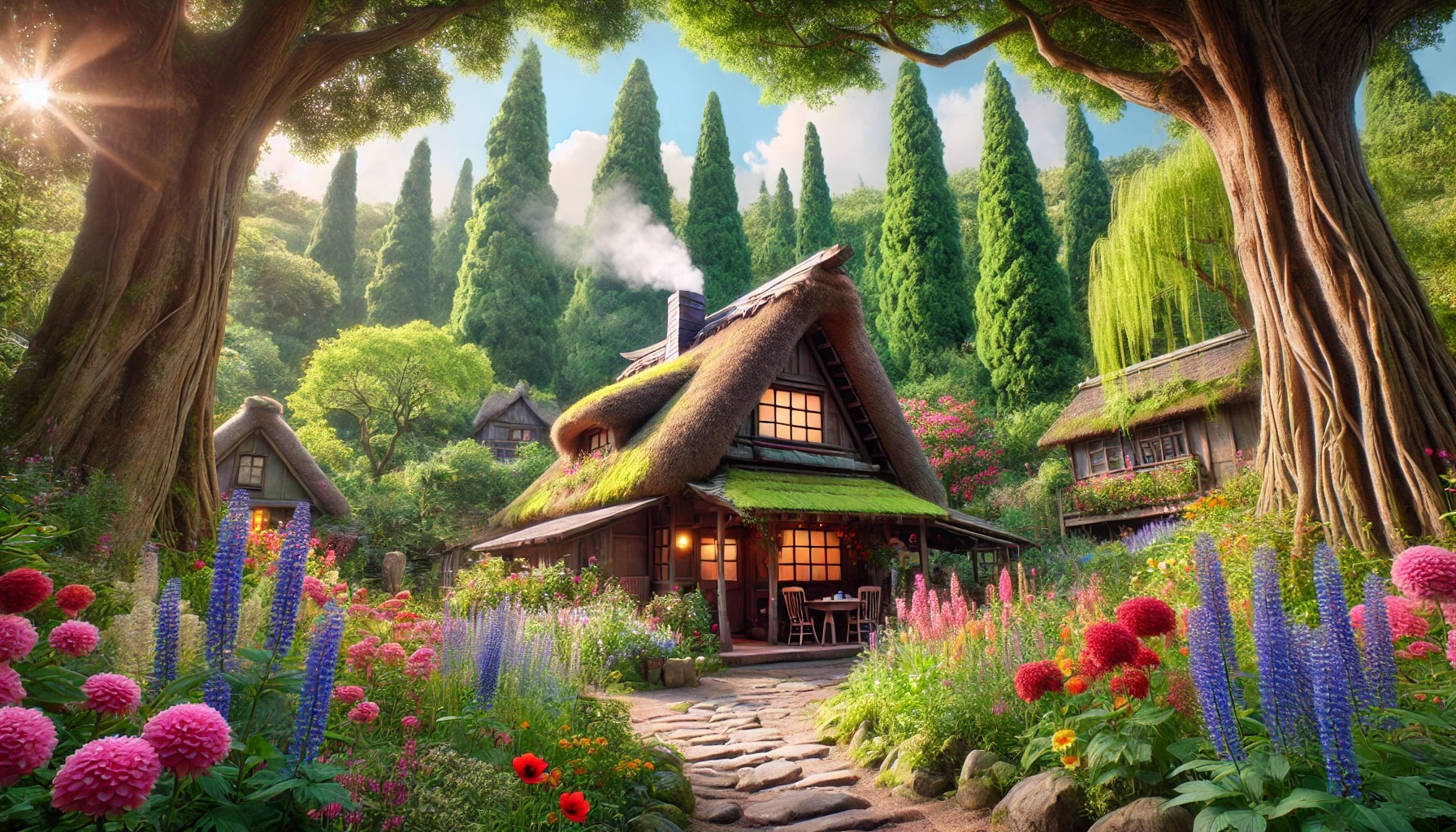 | 자연풍경 | "Ghibli style countryside with a cozy cottage surrounded by blooming flowers and tall trees." 지브리 스타일의 전원 풍경, 만개한 꽃과 키 큰 나무들로 둘러싸인 아늑한 오두막. |