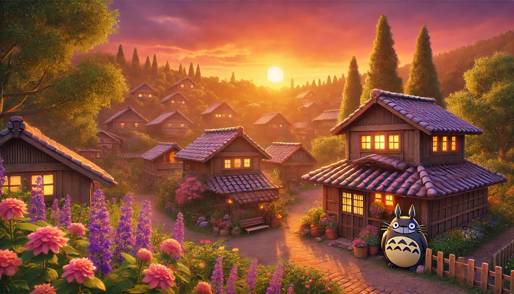 - "노을지는 시골 마을, 토토로 스타일의 따뜻한 분위기"