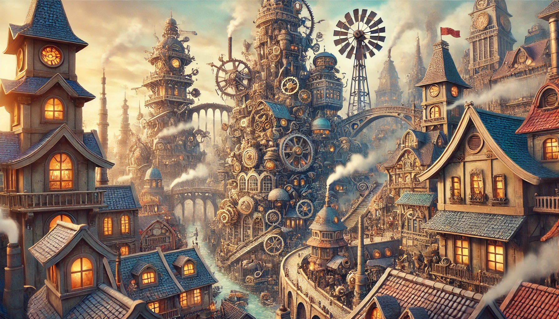 - "하울의 움직이는 성 스타일로, 기계가 많은 판타지 도시"