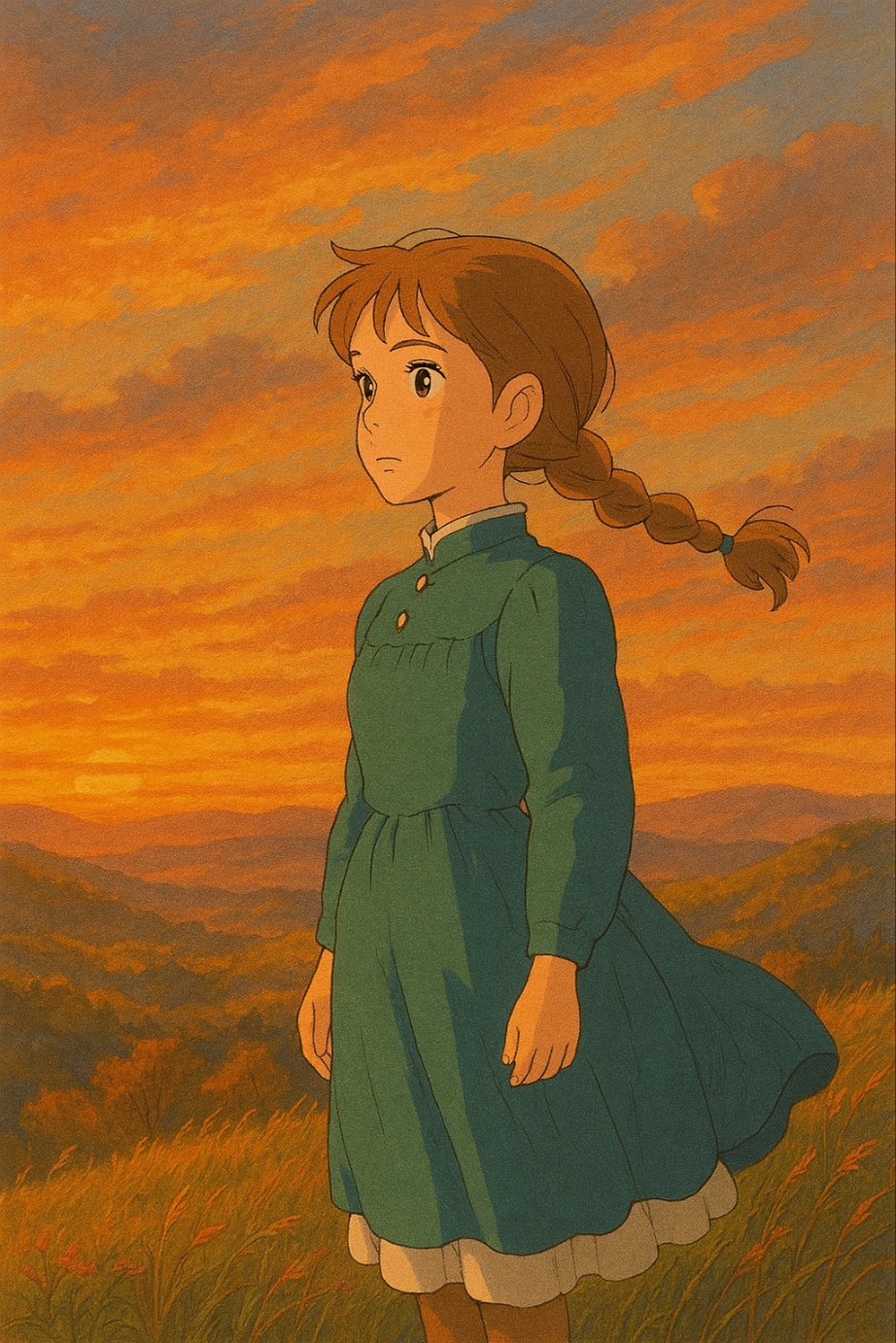 - "하울의 움직이는 성 스타일로, 노을이 지는 언덕에 서 있는 소녀를 그려줘."