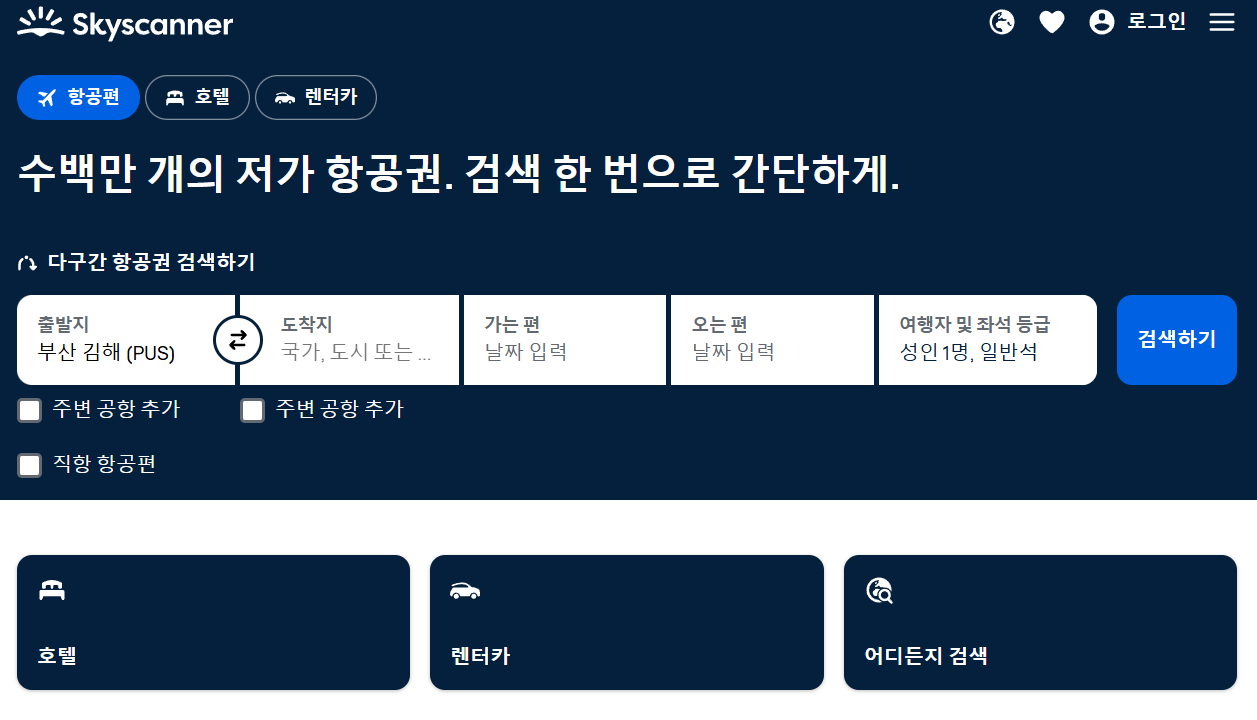 | 스카이스캐너 | 전 세계 항공사 가격 비교 가능 | 스카이스캐너 바로가기 |