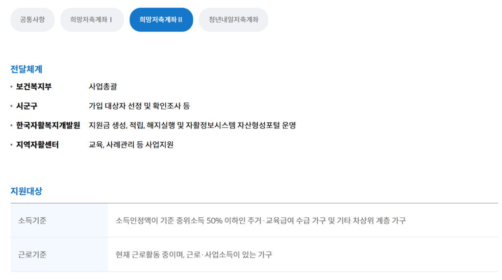 | 희망저축계좌 I | 월 10만 원 이상 | 월 30만 원 | 1,440만 원 (+이자) |
