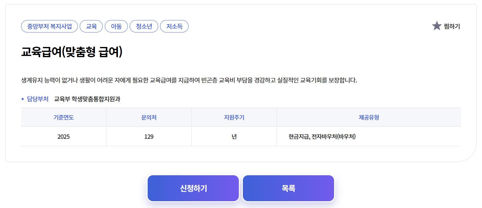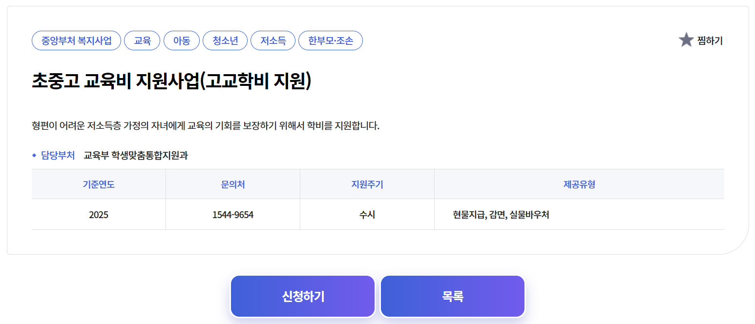 | 저소득층 수급 자격 기준 | 학생 또는 가구원이 생계·의료·주거·교육급여 수급자, 법정 한부모가족 보호대상자인 경우 |